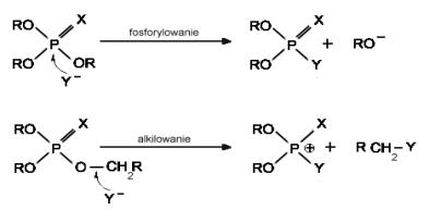 Rysunek 5.1. Przypuszczalny mechanizm fosforylacji i alkilowania z udziałem estrów fosforoorganicznych |